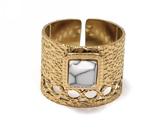 Γυναικείο Χρυσό Δαχτυλίδι με Ανάγλυφη Υφή και Τετράγωνο Λευκό Λίθο | 2412-037X