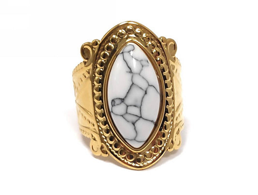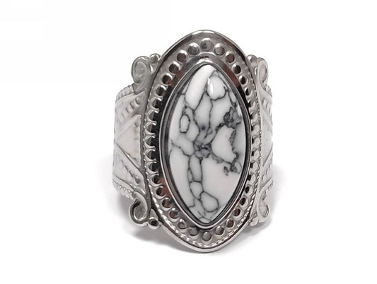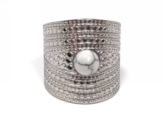Γυναικείο Ασημί Δαχτυλίδι με Ανάγλυφα Γεωμετρικά Σχέδια & Στρογγυλή Λευκή Πέτρα με Γκρίζες Φλέβες | 2412-038A