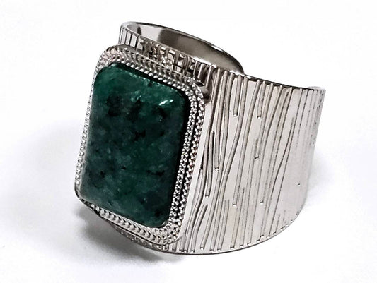 Ασημί Δαχτυλίδι με Πλατύ Σχέδιο και Πράσινη Ορθογώνια Πέτρα | 2512-406A