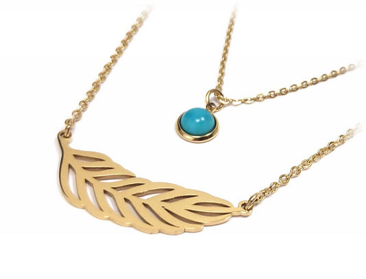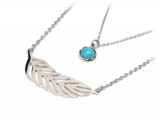 Γυναικείο Κολιέ με Διπλή Αλυσίδα και Μενταγιόν Φύλλο & Γαλάζια Πέτρα | 2212-458A