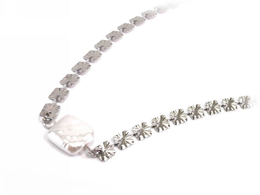 Κολιέ με Ασημένιους Κρίκους και Ορθογώνιο Μαργαριτάρι | 2212-471A