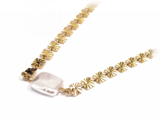 Χρυσό Κολιέ με Διακοσμητικούς Κρίκους και Τετράγωνο Μαργαριτάρι | 2212-471X