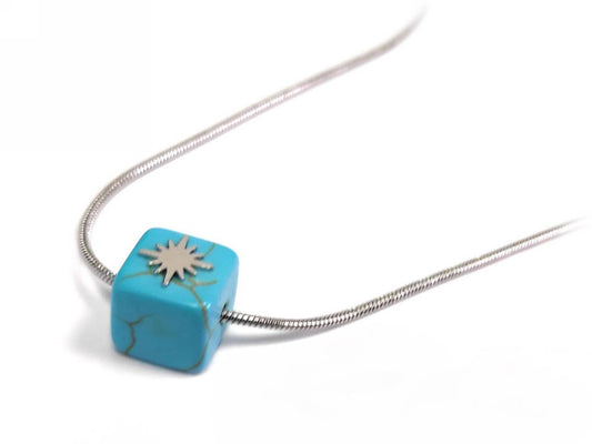 Κολιέ με Ασημένια Αλυσίδα και Μπλε Κύβο με Διακοσμητικό Αστέρι ή Ήλιο | 2212-475A