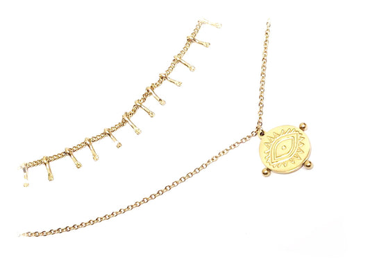 Χρυσό Διπλό Κολιέ με Μενταγιόν Μάτι και Κρεμαστά Στοιχεία | 2012-195X