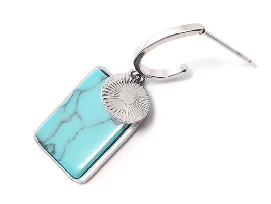 Γυναικεία Σκουλαρίκια Κρίκοι Ασημί με Ορθογώνιο Τυρκουάζ Μενταγιόν και Ανάγλυφο Στοιχείο | 2112-150A