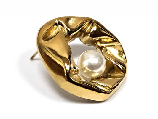 Χρυσά Ασύμμετρα Σκουλαρίκια με Μαργαριτάρι και Πτυχωτή Υφή | 2512-301X