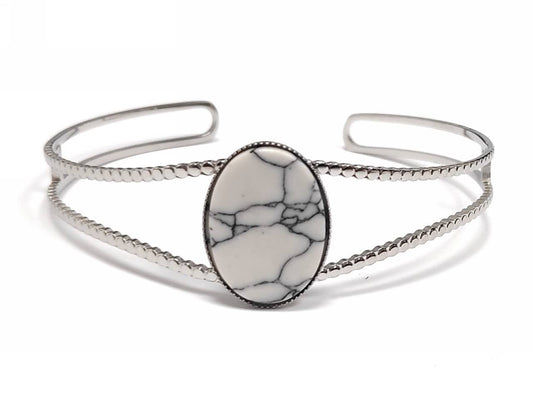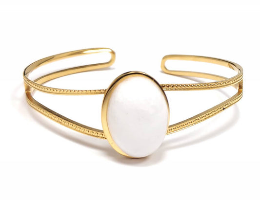 Κομψό Γυναικείο Βραχιόλι με Λευκό Πέτρινο Καμπούχο και Μεταλλική Κορνίζα | 2412-244A