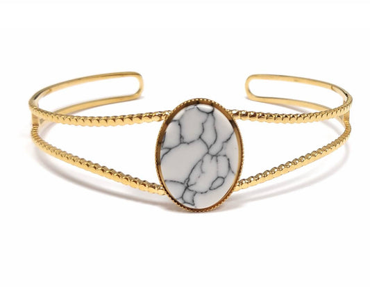 Κομψό Χρυσό Βραχιόλι Μανσέτα με Γαλάζια Οβάλ Πετράδια και Μαρμάρινες Υφές | 2412-262X