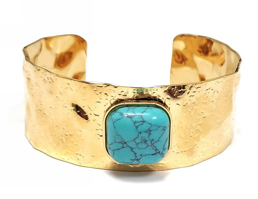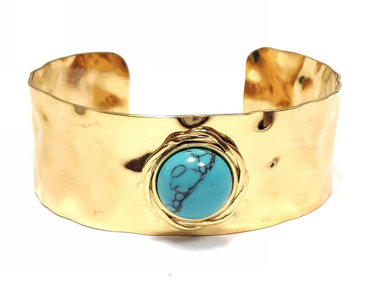 Χρυσό Γυναικείο Βραχιόλι Μανσέτα με Κεντρική Κυανή Πέτρα Τυρκουάζ και Σκαμπανευάσματα | 2412-264X