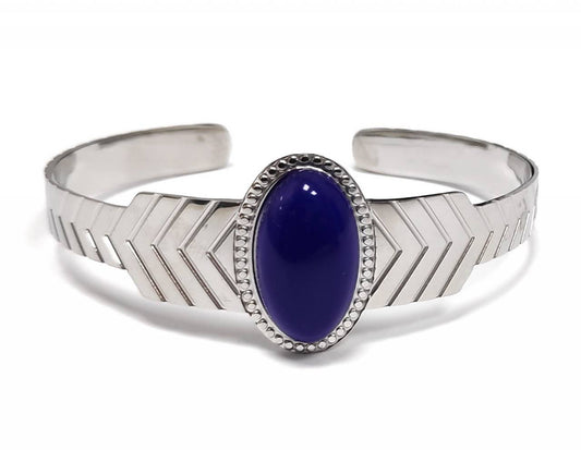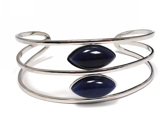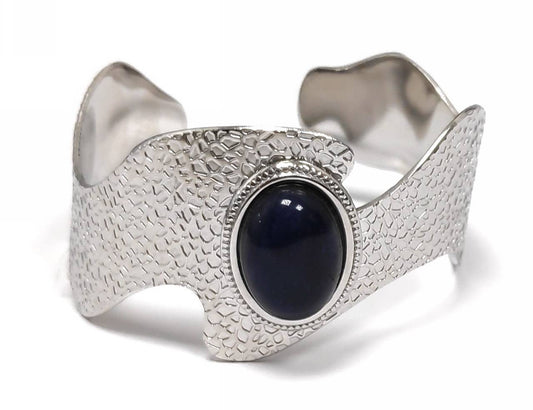 Εντυπωσιακό Ασημένιο Βραχιόλι Μανσέτα με Οβάλ Σκούρα Μπλε Πέτρα και Ανάγλυφο Μοτίβο | 2412-232A