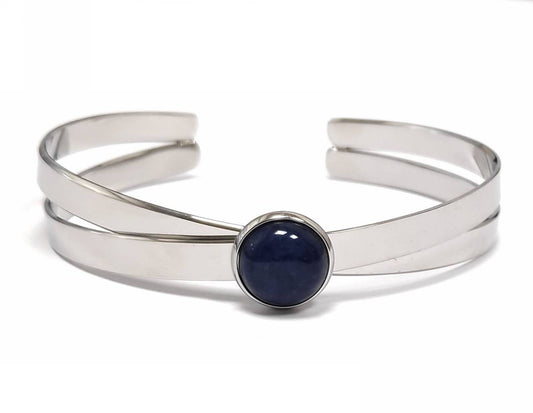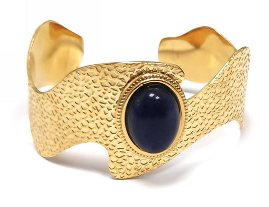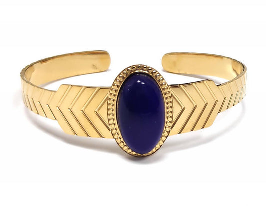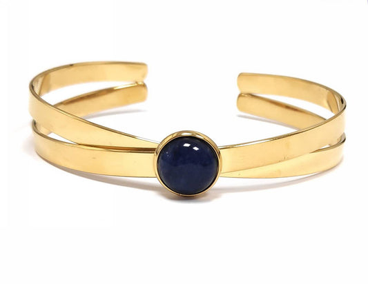 Κομψό Γυναικείο Χρυσό Βραχιόλι με Μεγάλη Σκούρα Μπλε Πέτρα και Μεταλλική Κορδέλα | 2412-232X