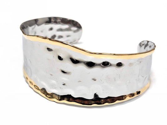 Γυναικείο Βραχιόλι Χειροπέδα από Μέταλλο σε Ασημί Χρώμα με Σφυρήλατη Υφή και Χρυσές Λωρίδες | 2512-211A