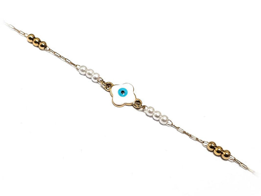 Γυναικείο Χρυσό Βραχιόλι με Λευκές Πέρλες και Μάτι Προστασίας | 2512-227X