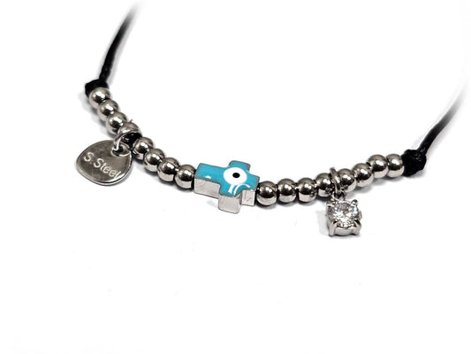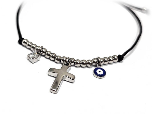 Γυναικείο Βραχιόλι με Μαύρο Κορδόνι, Ασημένιες Χάντρες, Σταυρό και Μάτι | 2512-229A