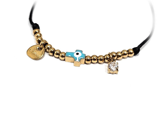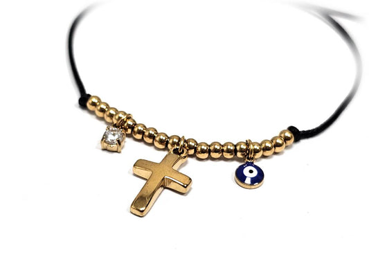 Γυναικείο Βραχιόλι με Μαύρο Κορδόνι, Χρυσές Χάντρες και Κρεμαστά Σταυρό, Πέτρα & Μάτι | 2512-229X