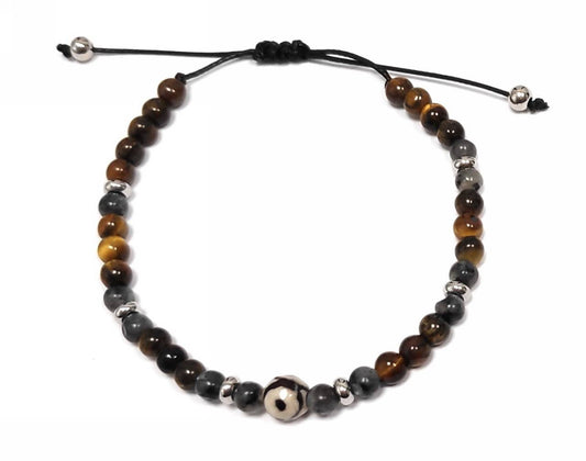 Ρυθμιζόμενο Γυναικείο Βραχιόλι Κορδονιού με Χάντρες Μάτι του Τίγρη και Αποχρώσεις Καφέ έως Γκρι | 2411-113