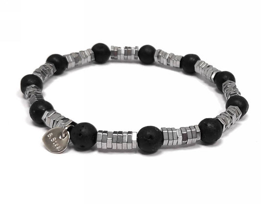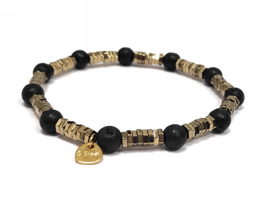 Γυναικείο Βραχιόλι με Μαύρες Ματ Χάντρες Λάβας και Χρυσαφί Ορθογώνιες Χάντρες με Κυψελωτό Μοτίβο | 2412-304X