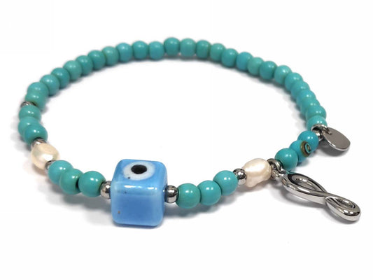 Γυναικείο Βραχιόλι με Γαλάζιες και Λευκές Χάντρες και Μεταλλικές Διακοσμήσεις - Μάτι του Κύβου | 2412-309A