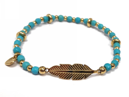 Γυναικείο Βραχιόλι με Γαλάζιες Τουρκουάζ Χάντρες και Χρυσή Διακοσμητική Πλάκα Φύλλο | 2412-313X